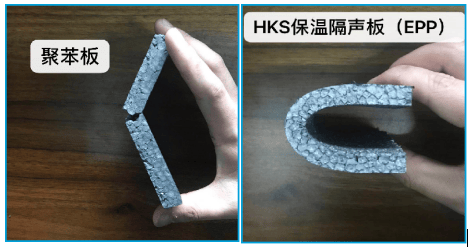 全面可彎曲:XPS、EPS(聚苯板)受力易斷裂,而HKS保溫隔聲板(EPP)可以實現180°彎曲。