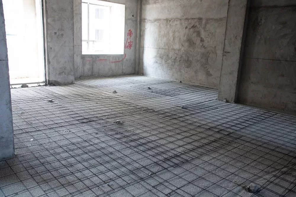 b.其次改性聚丙烯保溫隔聲板鋪設(shè)完畢后開(kāi)始澆筑混凝土(澆筑混凝土保護(hù)層時(shí),應(yīng)及時(shí)修正鋼筋網(wǎng)片的位置。墻角處、穿樓板管道處澆筑混凝土?xí)r,不得將混凝土澆入豎向隔離片和墻體之間。),混凝土保護(hù)層中部應(yīng)配置鋼筋網(wǎng)片(鋼筋網(wǎng)片應(yīng)潔凈、無(wú)損傷,可在鋼鋼筋網(wǎng)片下面墊上墊塊,確保鋼筋網(wǎng)片置于混凝土保護(hù)層的中間位置,鋼筋綁扎時(shí),應(yīng)避免鐵絲頭刺破HKS改性聚丙烯保溫隔聲板和防水膠帶)。